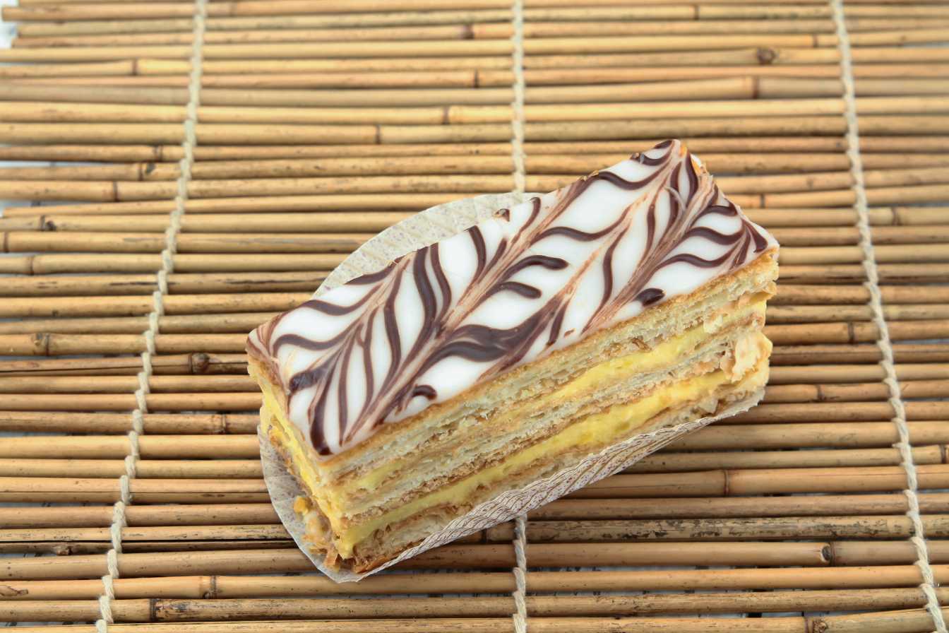Le glaçage du mille-feuille constitue la signature visuelle de cette pâtisserie. Le motif marbré blanc et chocolat représente l’esthétique classique des grandes pâtisseries françaises.